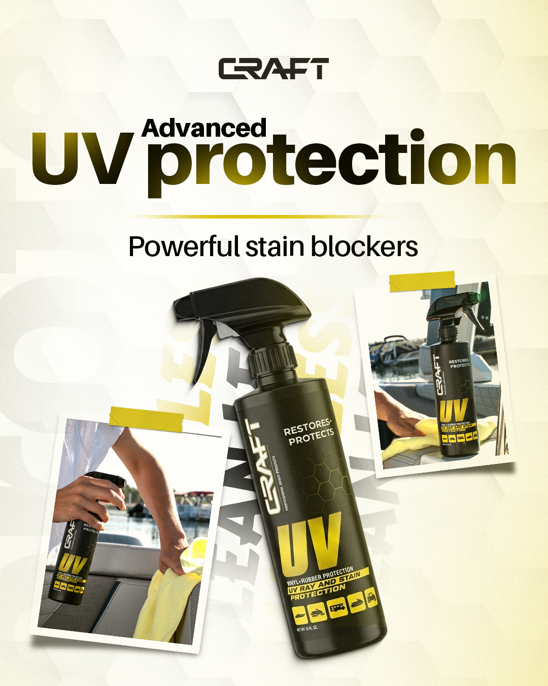 Our version of sunblock for your boat. It protects, restores, and defends. CRAFT UV keeps vinyl fresh and protected with powerful UV blockers that shield your boat from the sun’s harshest effects. Revives lost color and shine while guarding against even the toughest stains. Simply spray and wipe on any vinyl, rubber, plastic, and finished leather to keep surfaces looking new, longer.